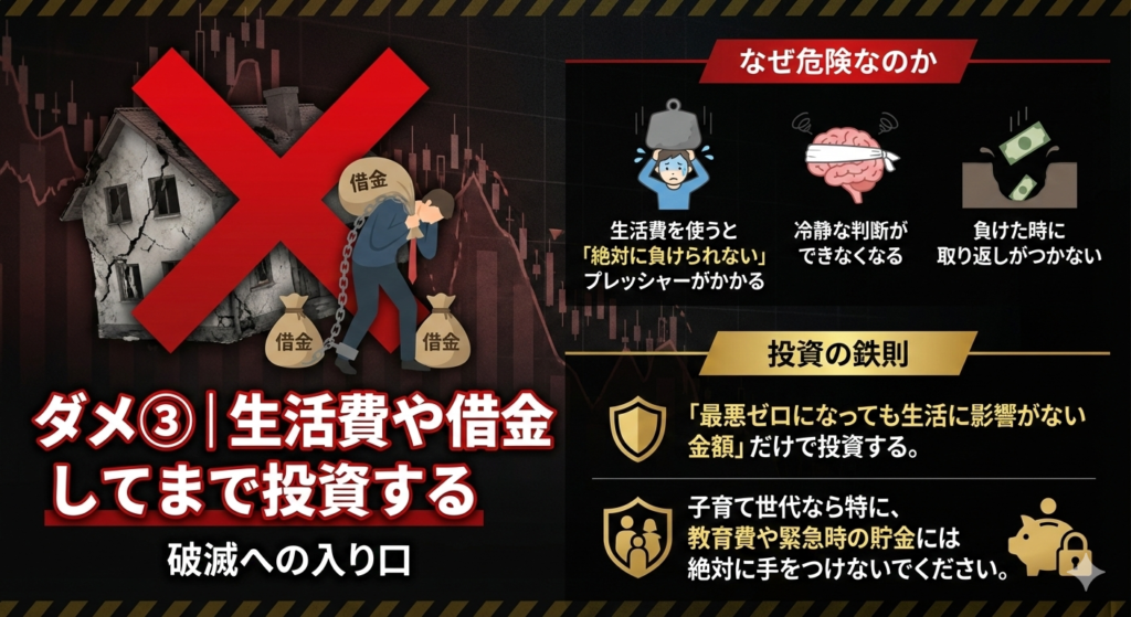 | ① | 余剰資金のみ投資する | 生活費を削って投資→暴落でパニック売り |